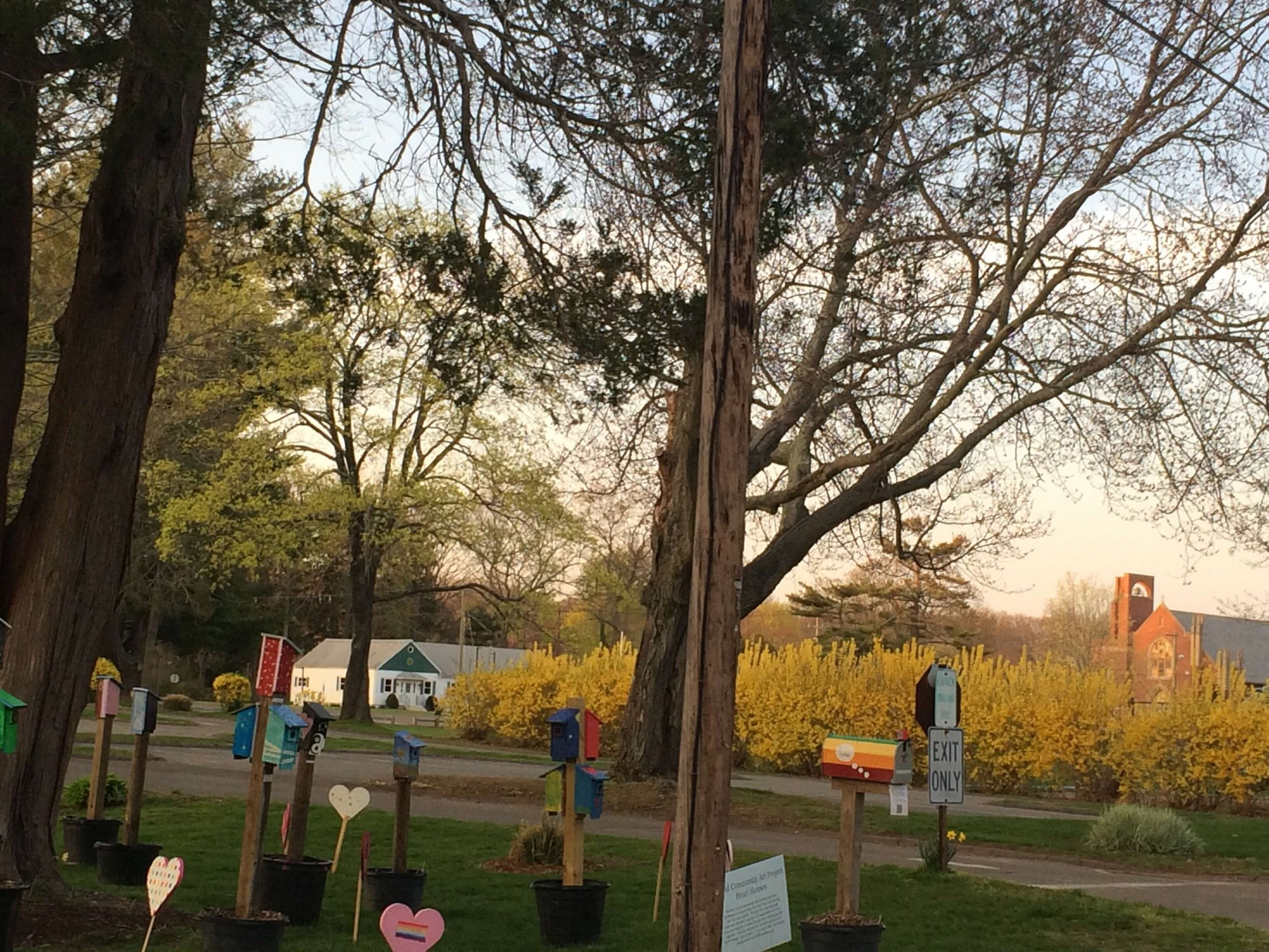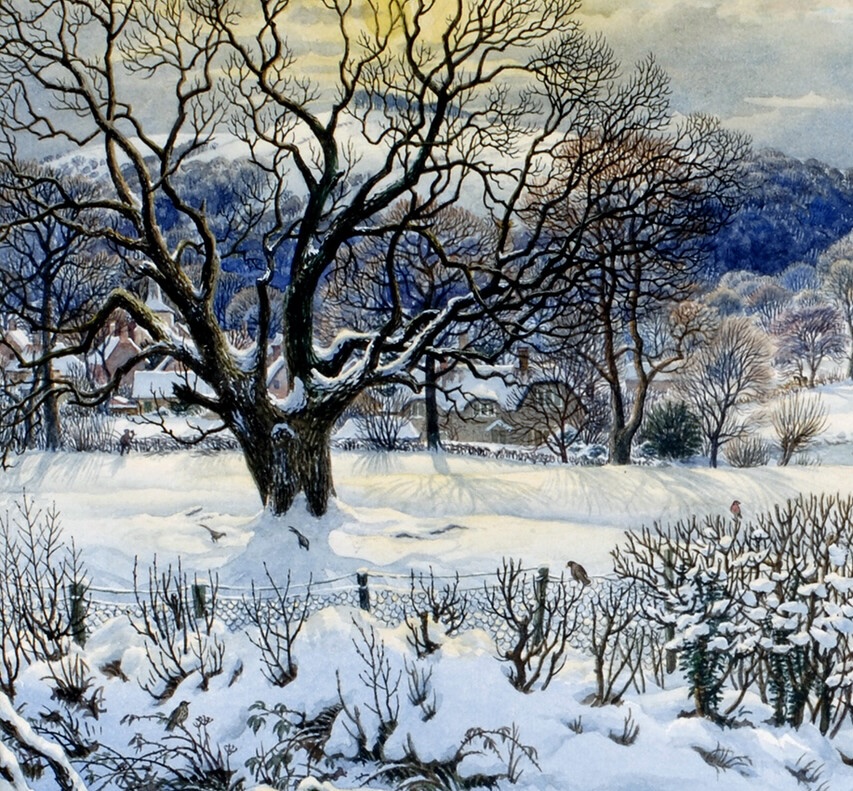 “Winter Sunrise,” by S.R. Badmin; the Covid Memorial Wall with commemorative hearts in London; and a local community art project on my town green in 2020.